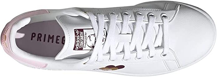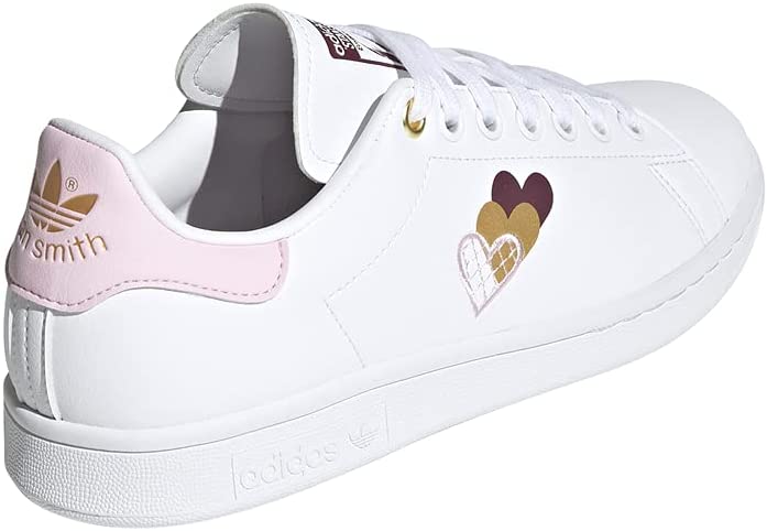 Los Adidas Stan Smith White Pink Gold Heart son una versión moderna de los clásicos zapatos de tenis Stan Smith. Están hechos de cuero blanco con detalles en rosa y dorado. El corazón dorado en el lado exterior de cada zapato es un toque único y moderno.
