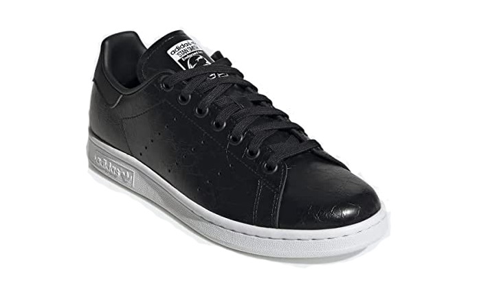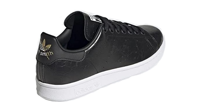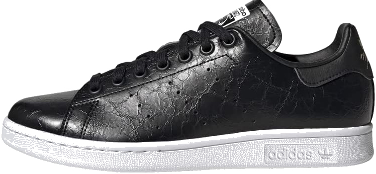 Los adidas Stan Smith Cracked Leather Black Gold son una versión moderna de los clásicos zapatos de tenis Stan Smith. Están hechos de cuero con un acabado envejecido y una suela de goma. El diseño de los zapatos es negro con detalles dorados en la parte trasera.