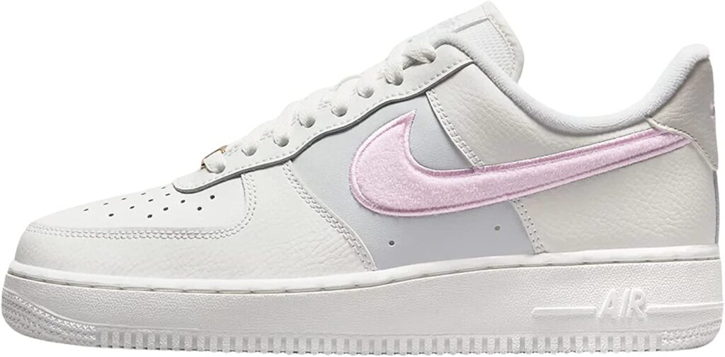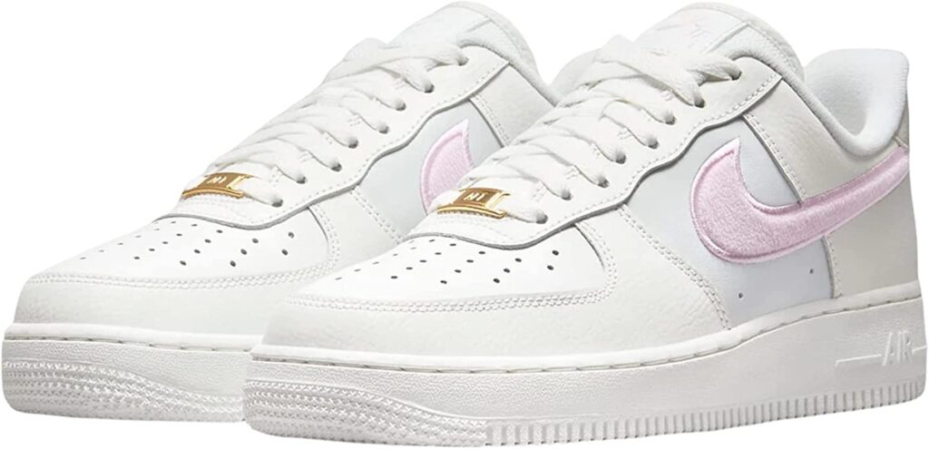 La Nike Air Force One white/pink es una zapatilla clásica que presenta una parte superior de cuero blanco con detalles en rosa. El zapato tiene una silueta de corte bajo y un cuello acolchado para mayor comodidad. La entresuela está hecha de amortiguación Nike Air para una amortiguación ligera y la suela exterior está hecha de caucho para brindar tracción y durabilidad. El zapato también presenta el icónico logotipo de Nike Swoosh en color rosa en la parte lateral del sneaker .