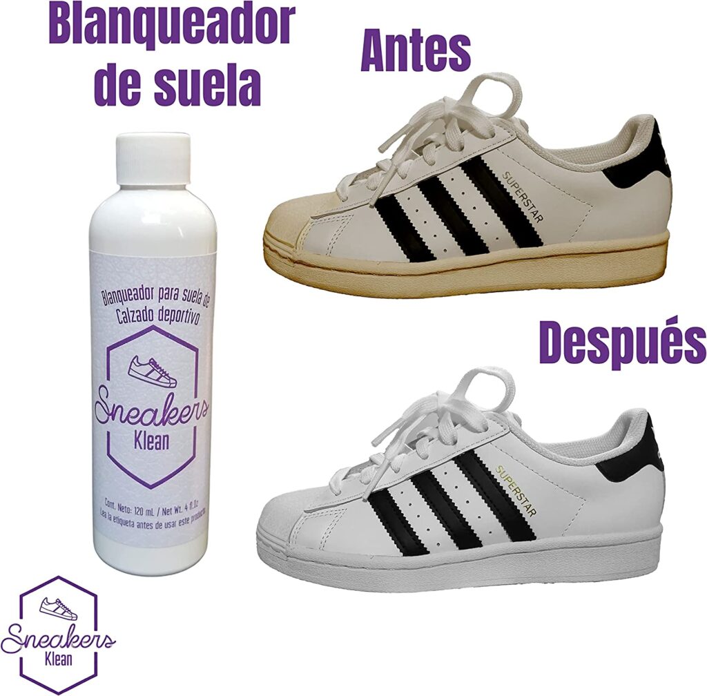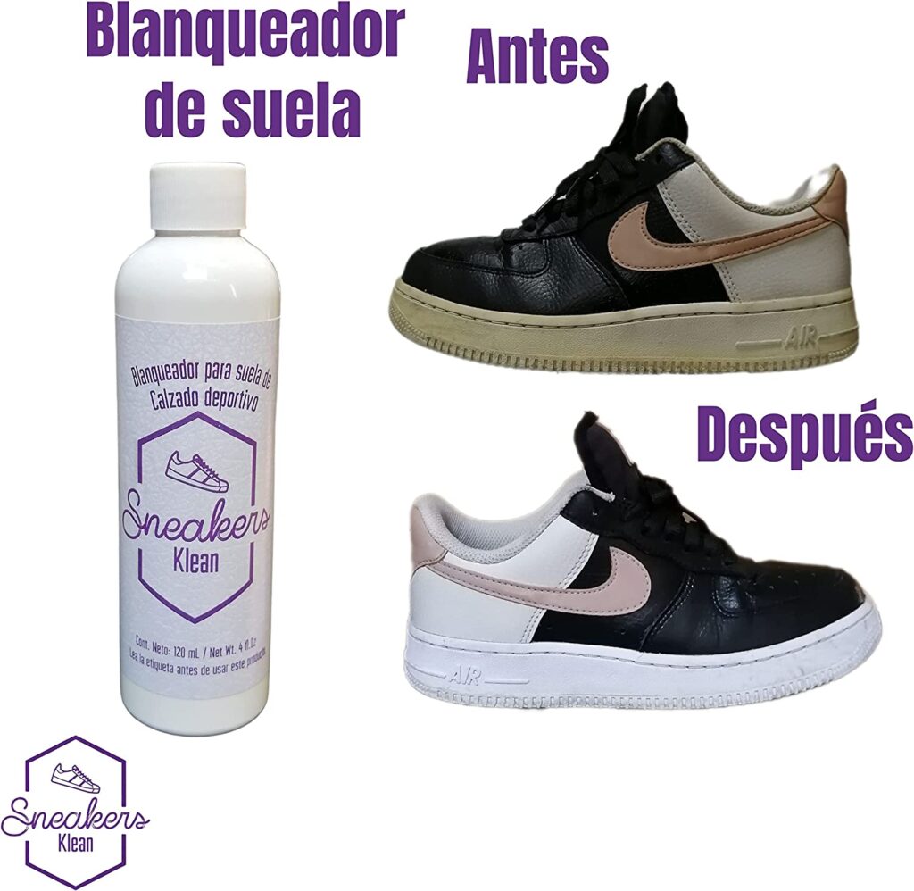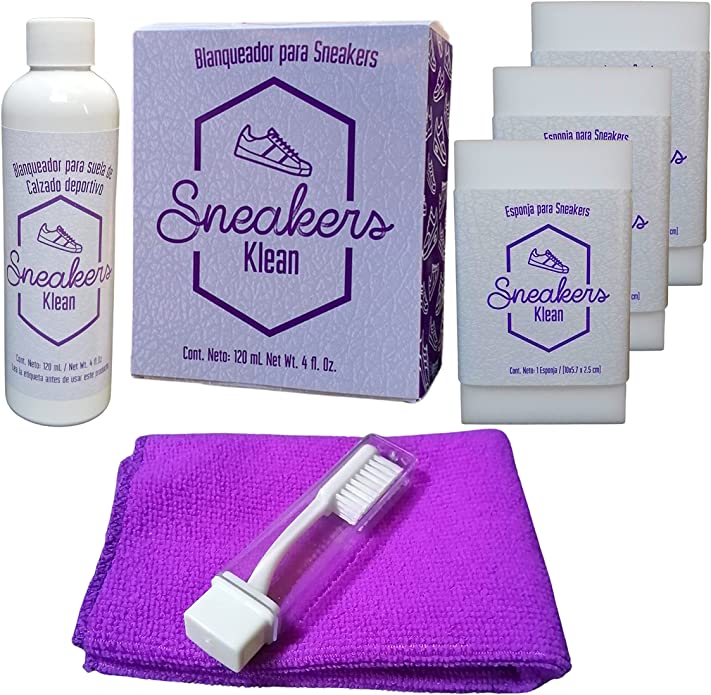 kit de limpieza para el cuidado de sneakers, contiene 3 esponjas limpiadoras, 1 blanqueador de suela de 120 ml, 1 cepillo aplicador y microfibra.